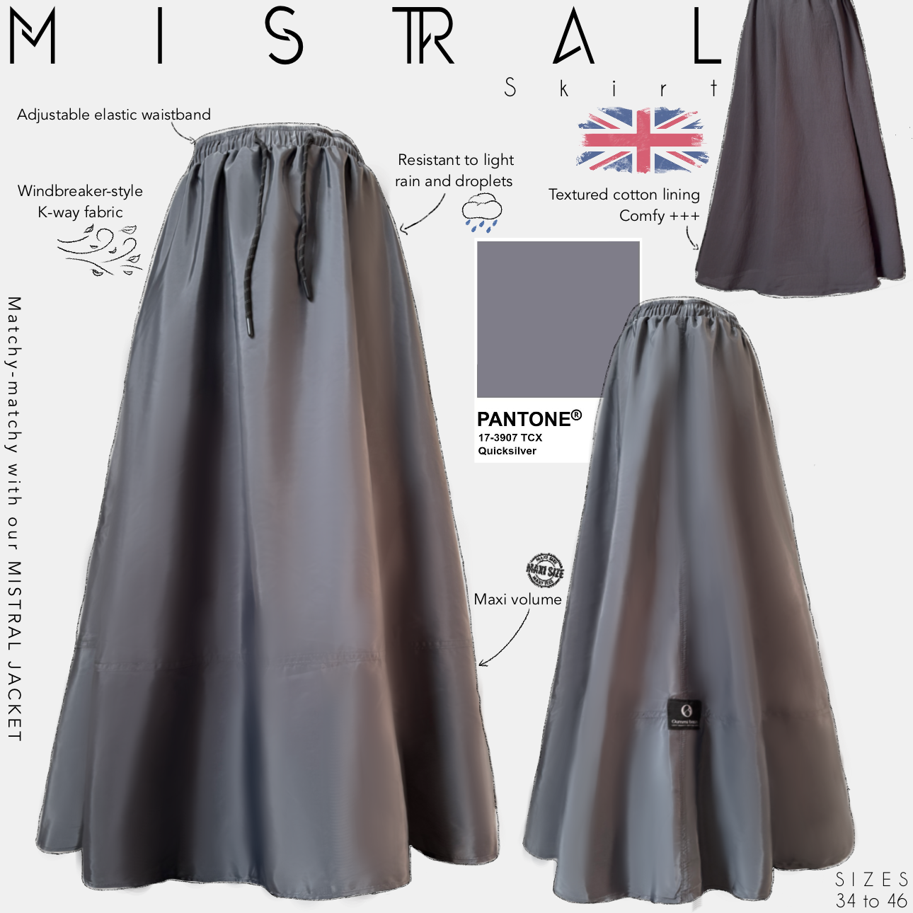 La MISTRAL SKIRT est la pièce idéale à superposer avec la MISTRAL JACKET, réalisée dans le même tissu, pour une tenue matchy-matchy. Que ce soit pour une journée de travail, une sortie en ville ou une promenade sous la pluie, cette jupe te garantit de rester au sec et à l’aise.