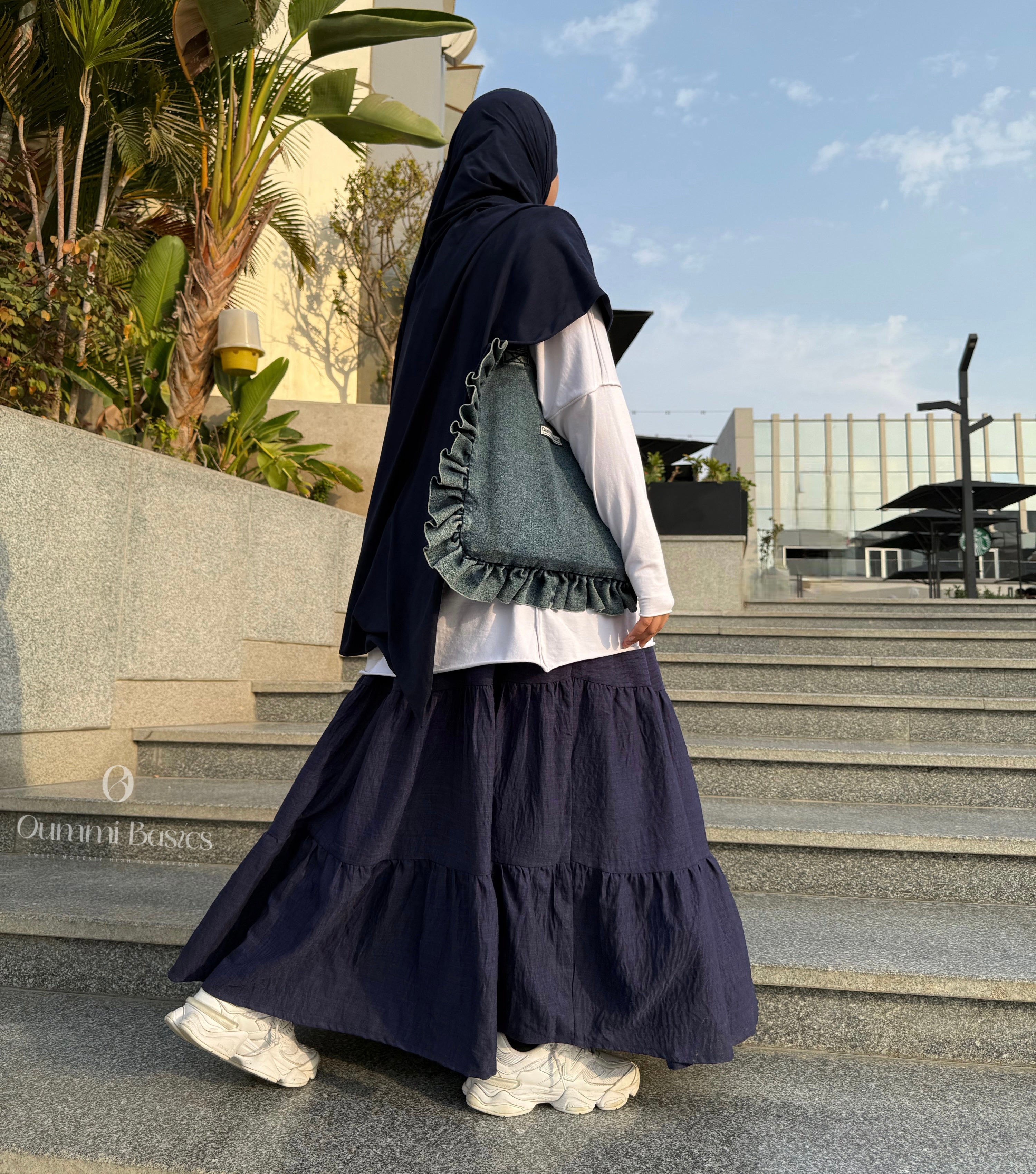 Son denim haut de gamme, ses froufrous travaillés et sa silhouette bohème chic en font un accessoire fort, capable d’apporter du caractère à vos looks sans jamais en faire trop.