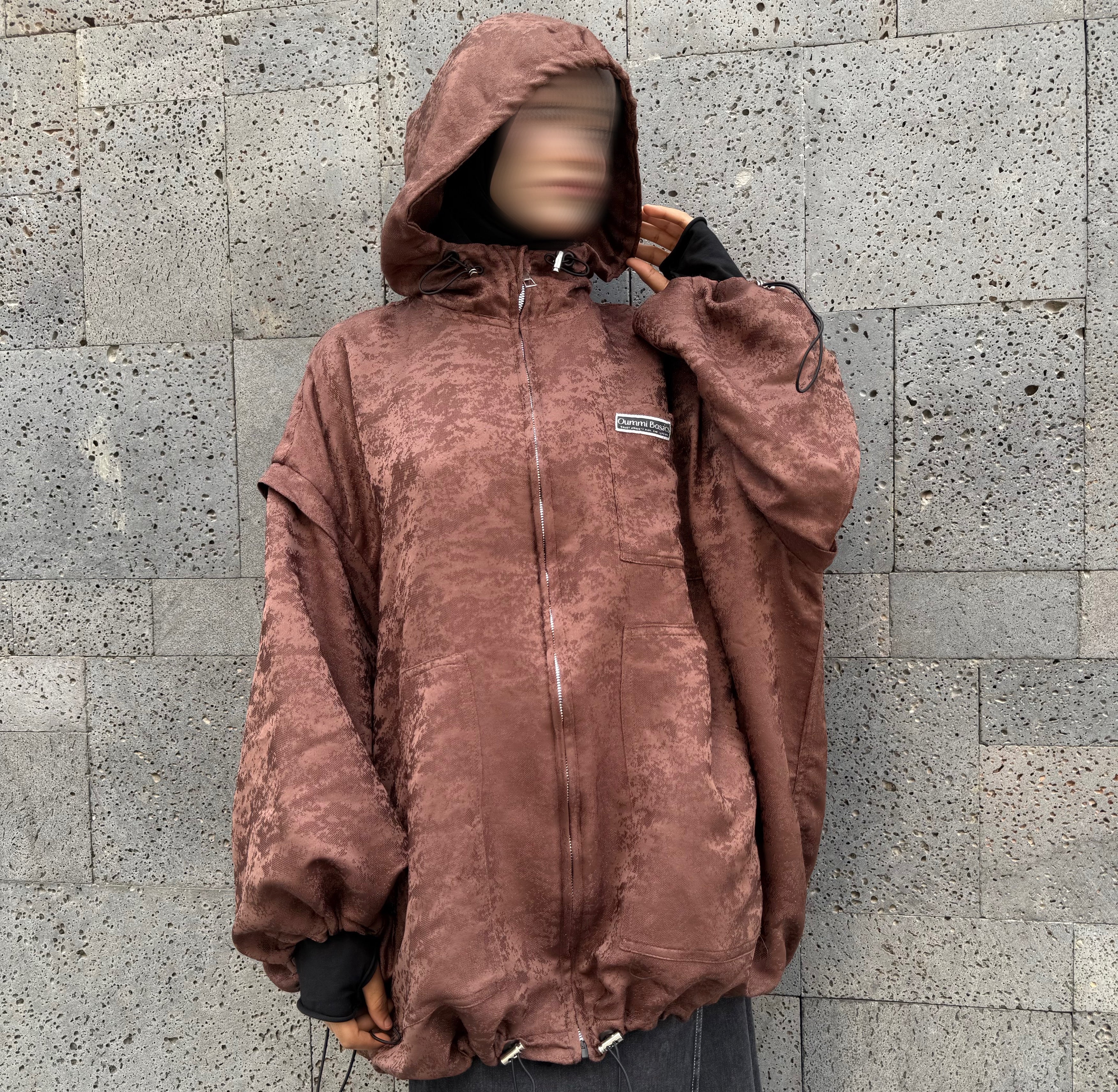 Le brocard est un tissu riche et délicat, souvent orné de motifs floraux ou baroques. Traditionnellement associé aux vêtements de luxe, il confère à la veste une allure sophistiquée sans pour autant être tape à l'oeil. La coupe oversize ajoute une touche moderne tout en assurant un confort et une couvrance optimale.