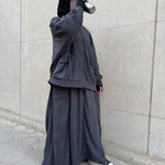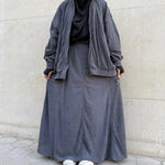 Nous avons voulu créer une veste douce, chaleureuse et facile à vivre, qui puisse se porter aussi bien sur une abaya que sur vos tenues du quotidien.