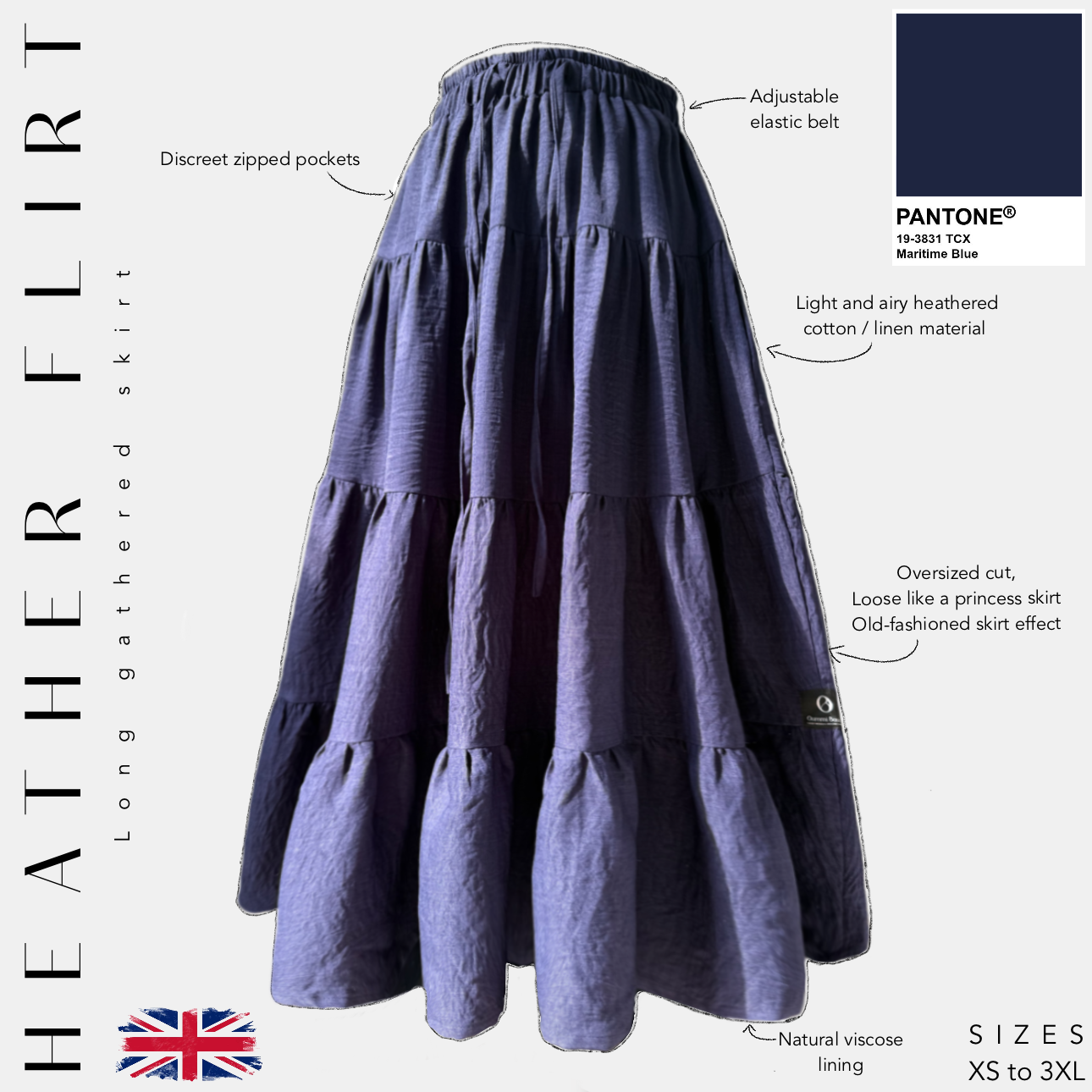Beginnen wir mit den wesentlichen Punkten, die bei der Wahl eines langen Rocks den entscheidenden Unterschied ausmachen. Mit seinen fließenden Linien und dem ausgestellten Schnitt verspricht er nicht nur eine feminine Silhouette, sondern auch ein unvergleichliches Gefühl von Freiheit. In der Taille befindet sich ein verstellbarer Gummibund, der sich ideal an alle Körpertypen bis Größe 46 anpasst. Dieses Detail wird durch einen dezenten, aber effektiven Kordelzug verstärkt.