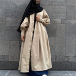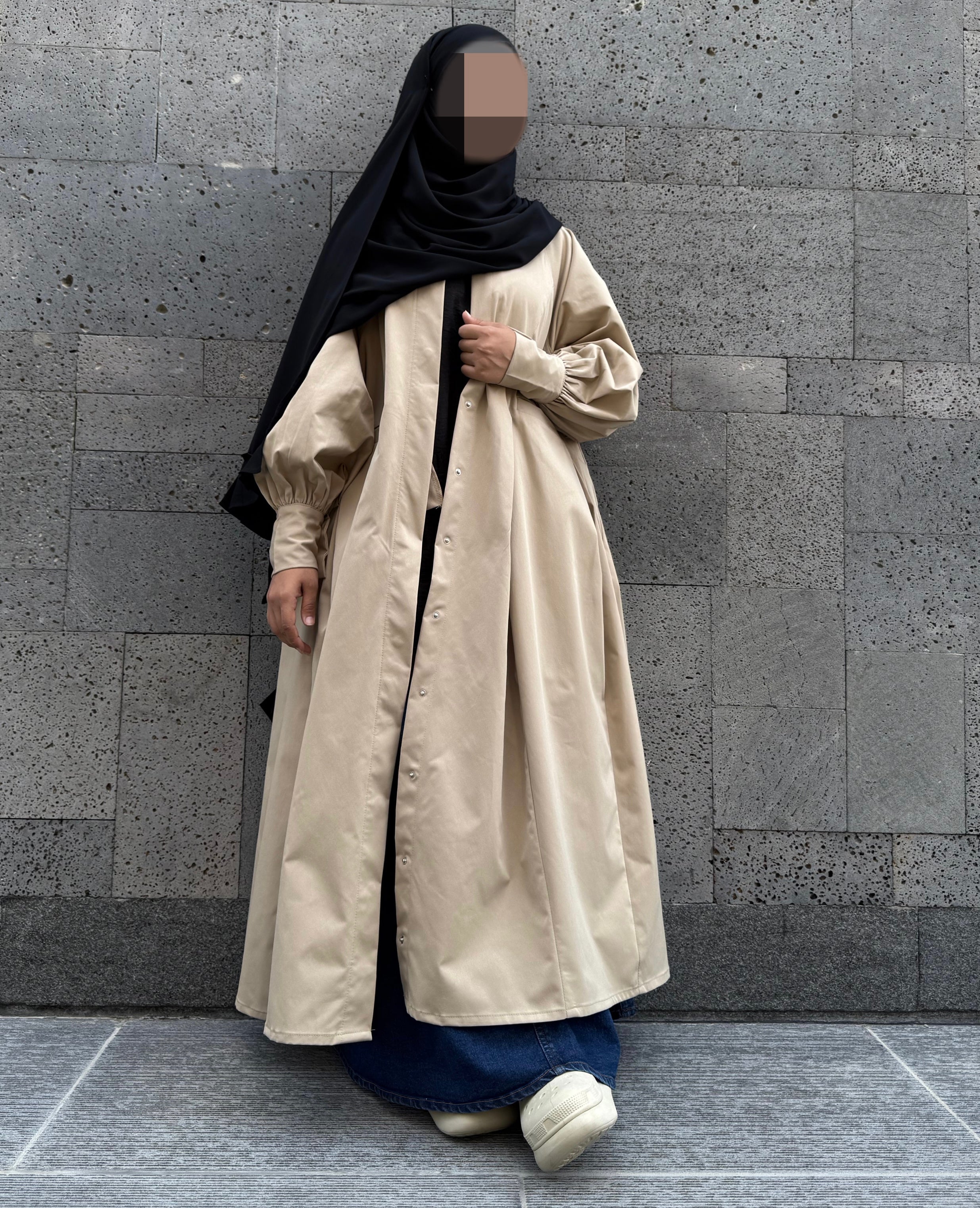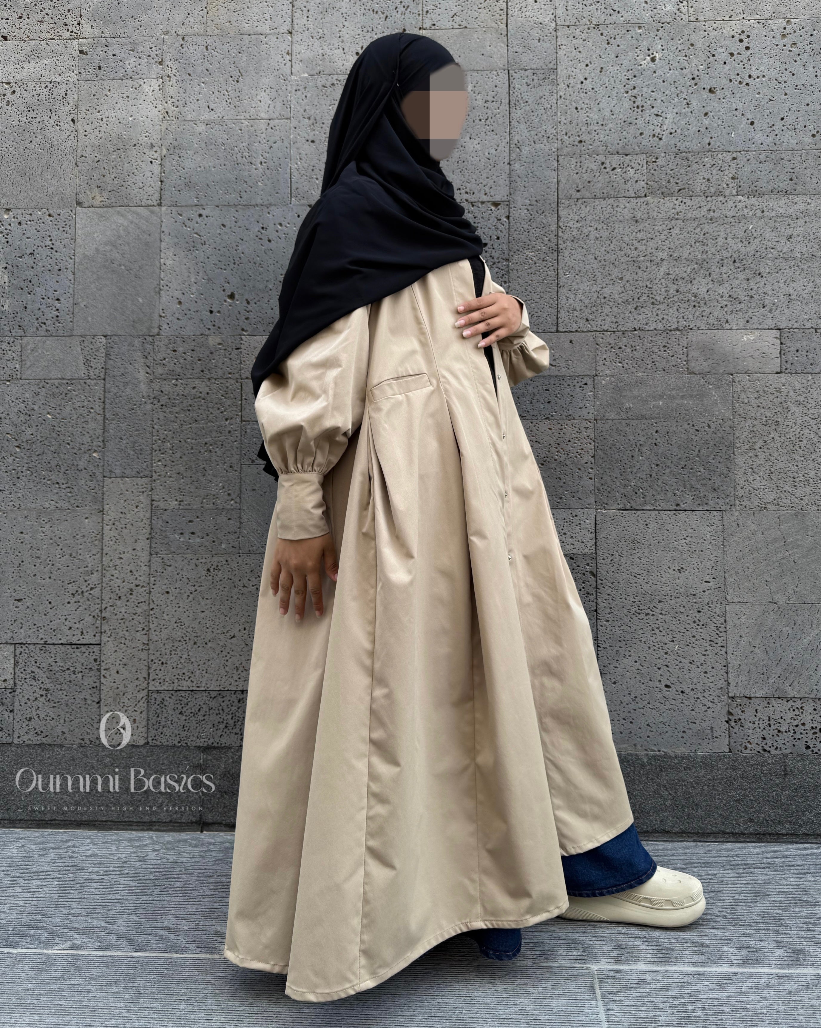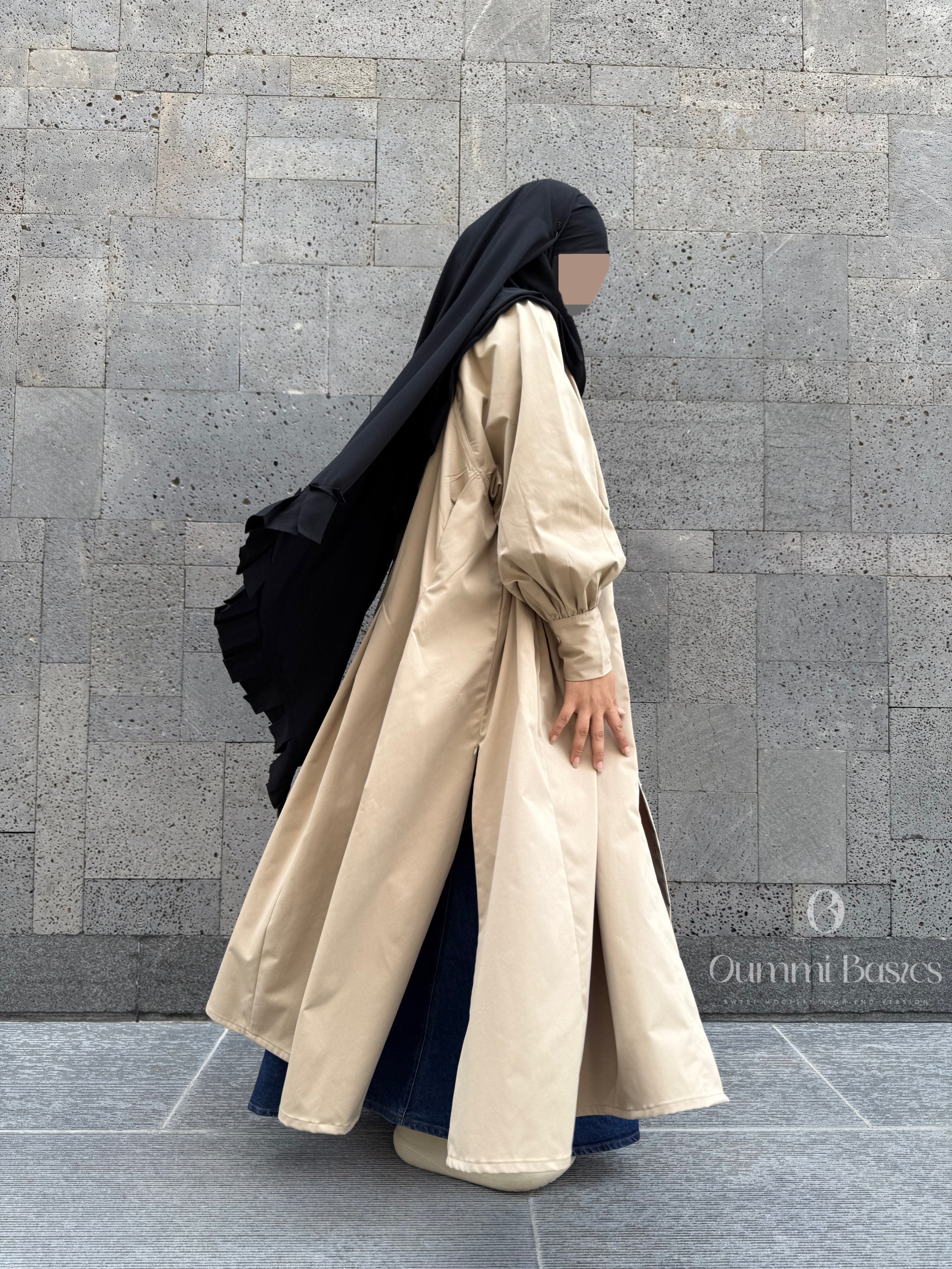 Ce trench chemise se distingue également par ses manches longues bouffantes qui s’achèvent sur de larges manchettes à boutons couvrant gracieusement le haut de la main. Ce choix de finition illustre parfaitement l’attention portée aux détails contemporains : les poignets structurent la silhouette et ajoutent une note raffinée à chaque mouvement.